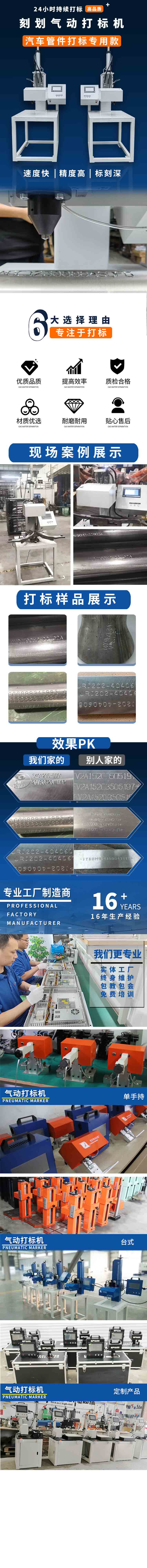 氣動劃刻機是氣動打標(biāo)機的其中一種,刻劃是指用硬質(zhì)合金或金剛石針在材料表面刻出文字和LOGO等,在圓面,平面,凹面或供面上刻出凹槽而形成連續(xù)直線,并且適用于任何材質(zhì)。也被稱為“劃線”式打標(biāo)。其適用于車架號、不銹鋼、法蘭、發(fā)動機號、銘牌、鋼瓶等多種行業(yè)加工,特別適用于對劃刻深度有特殊要求:如汽車VIN、鋼材熱處理前標(biāo)識、閥門深度、石油管道標(biāo)識等。