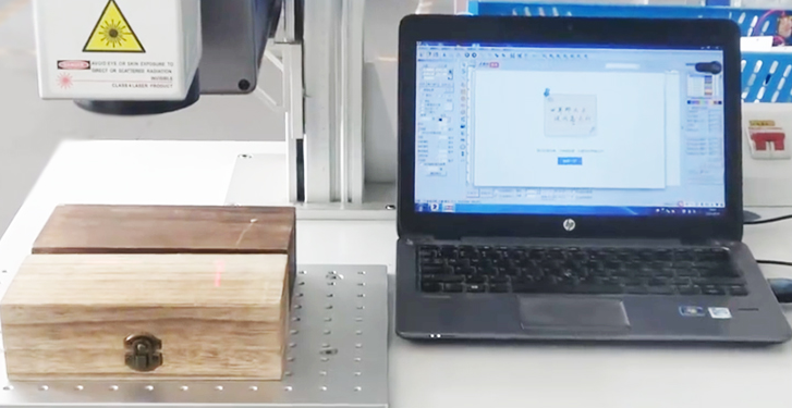 5、然后將激光打標機的立柱搖桿向上慢慢的搖動,直到打標機的兩個激光紅點重合即可。
