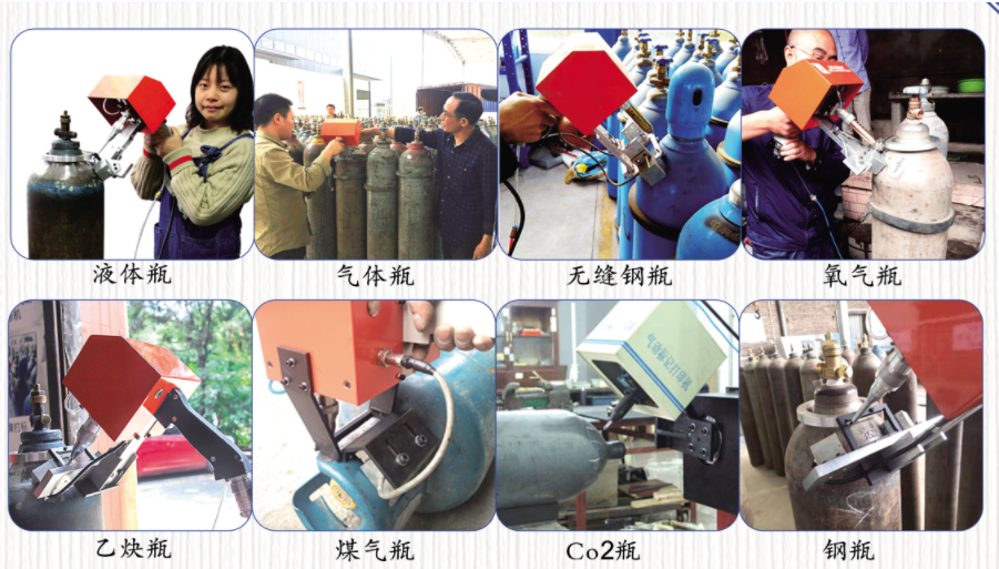目前主要用于天燃氣鋼瓶、液化氣鋼瓶、氧氣鋼瓶、氮氣鋼瓶、乙炔鋼瓶、鋁瓶、滅火器瓶、民用鋼瓶、液體罐等各種鋼瓶進行字符打標。